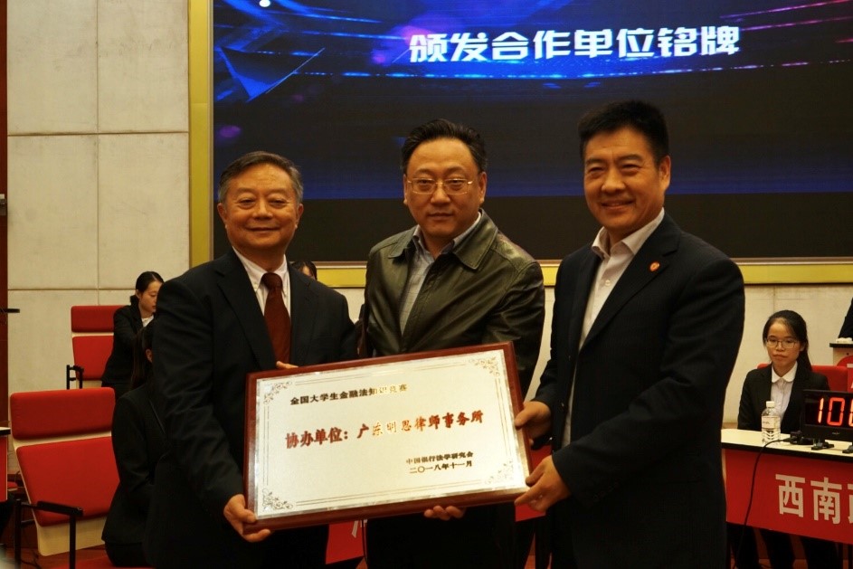 由中国银行法学研究会主办,西南政法大学经济法学院等协办的“第五届全国大学生金融法知识竞赛”全国决赛于2018年11月16日在西南政法大学顺利举行,广东明思律师事务所作为大赛战略合作伙伴,由主任方昀博士等作为特邀嘉宾代表出席,并现场接受授牌。