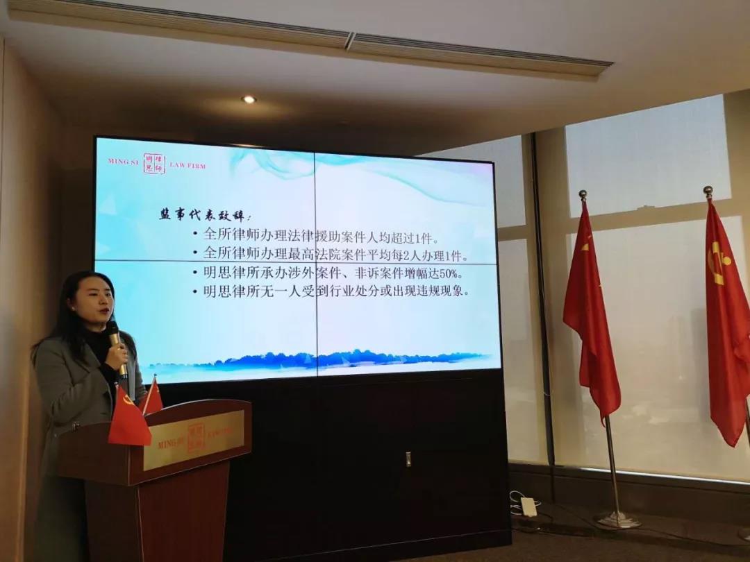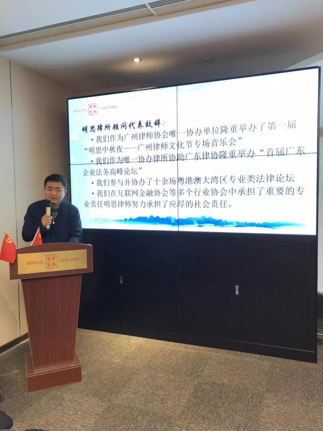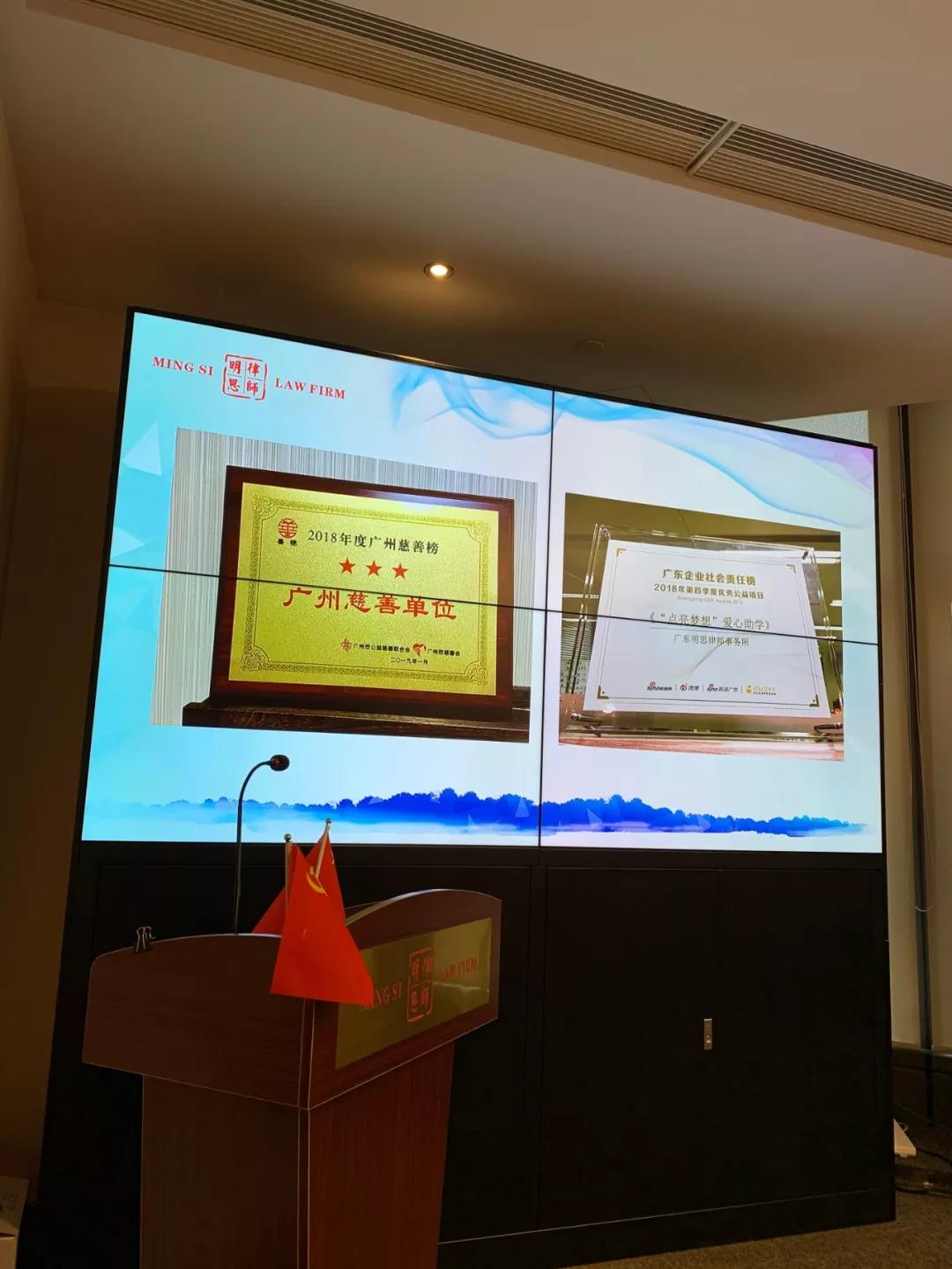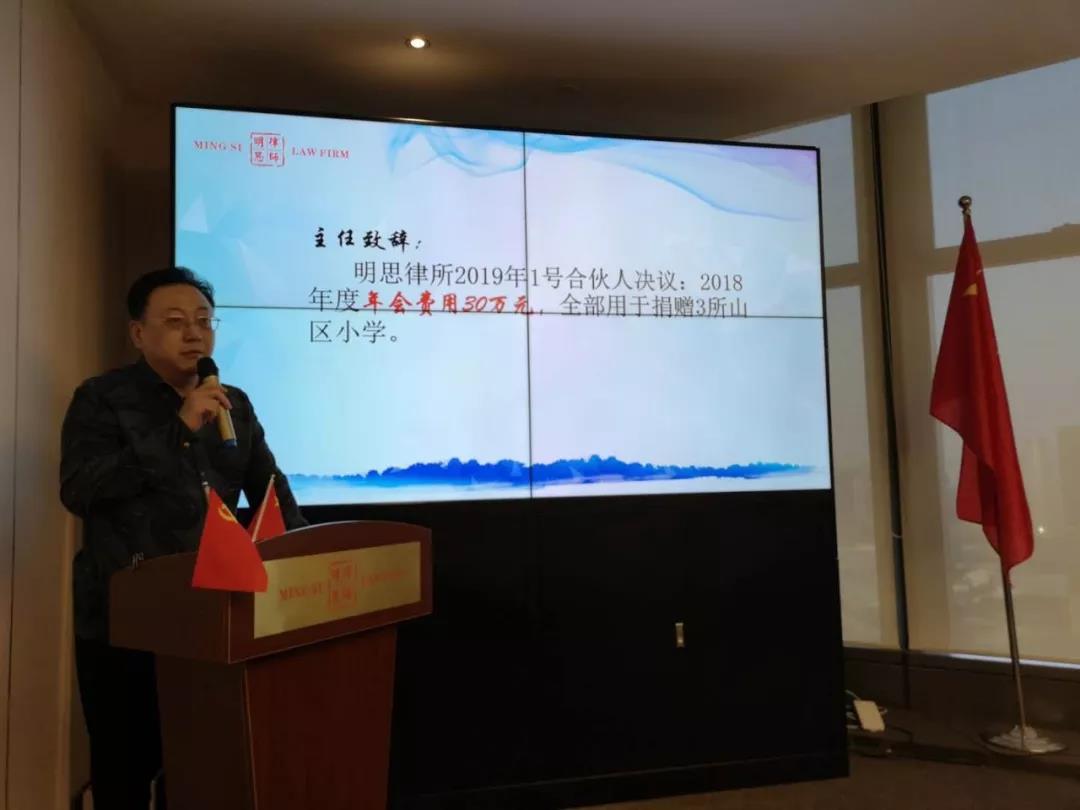 十年前汶川地震,我们明思所律师捐款是广州律师中的第一名;2018年,明思律所公益捐款超过200万元,同比增长20%,获得省律协最高表彰——“卓越公益律所”;今天,我们响应明思党支部建议,将迎新年会从酒店改到律所办公室,我们将年会专款30万元再次捐赠给了贫困山区的三所小学。