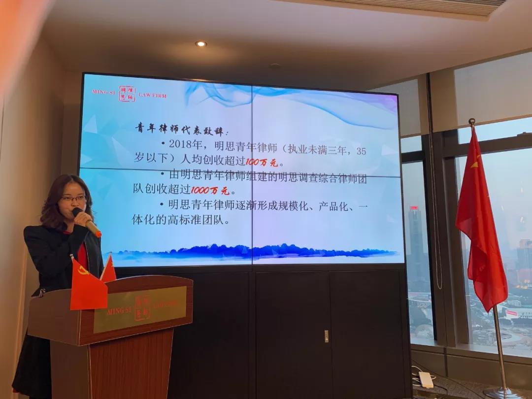 2018年,我们律所发展最大的收获是什么?是在明思党支部和十名合伙人律师的无私帮助下,我们自豪地宣布:明思青年律师(执业未满三年,35岁以下)在2018年的创收之总和,第一次超越全体合伙人——明思青年律师人均创收超过百万元,重点表扬青年律师组成的“明思调查综合团队”在2018年创造了本所三个纪录:行业群体性客户信赖度反馈、民营企业法律顾问数量、团队成员人均创收均为本所第一,这标志着明思青年律师逐渐形成规模化、产品化、一体化的高标准团队。我们期待,明思青年律师也必然成为明思律所的未来之星、核心合伙人。