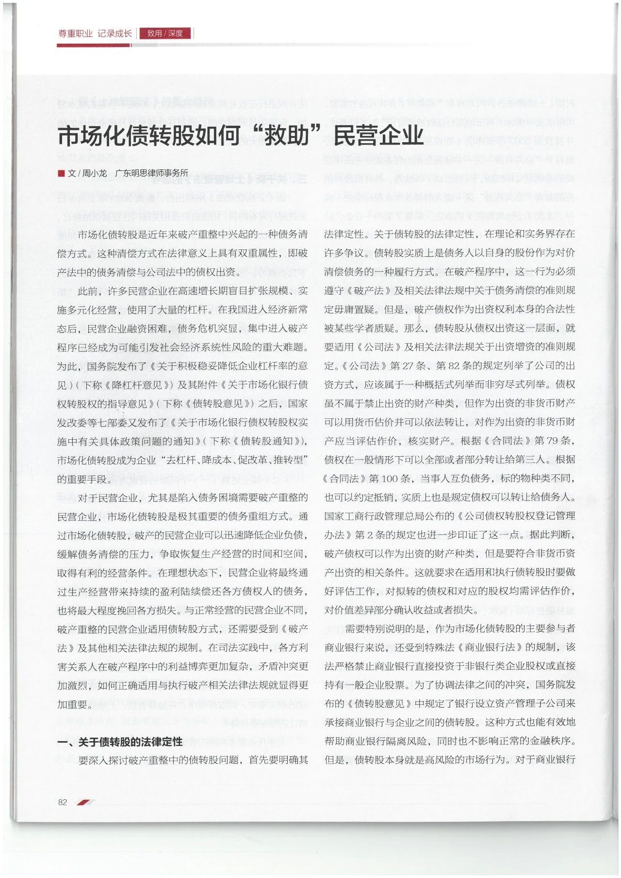 2019年11月,明思所合伙人周小龙律师撰写的“市场化债转股如何‘救助’民营企业”一文在2019年第11期《中国律师》杂志刊登。