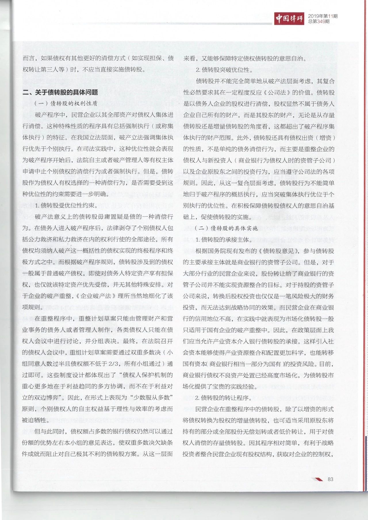 市场化债转股是近年来破产重整中兴起的一种债务清偿方式,是企业“去杠杆、降成本、促改革、推转型”的重要手段。在理想状态下,民营企业将最终通过生产经营带来持续的盈利陆续偿还各方债权人的债务,也将最大程度挽回各方损失。与正常经营的民营企业不同,破产重整的民营企业适用债转股方式,还需要受到《破产法》及其他相关法律法规的规制。在司法实践中,各方利害关系人在破产程序中的利益博弈更加复杂,矛盾冲突更加激烈,如何正确适用与执行破产相关法律法规就显得更加重要。本文就债转股的法律定性以及具体适用问题进行分析,深入探讨破产重整中的债转股问题。